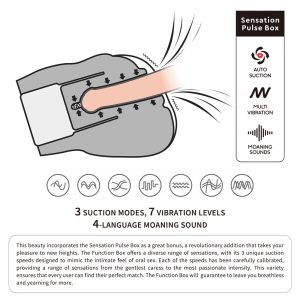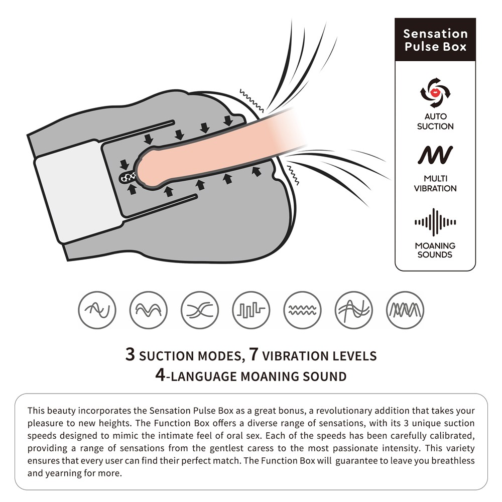 Ecco il nostro strumento di piacere dal design squisito, il Masturbatore Streetgirl’s con la rivoluzionaria Sensation Pulse Box. Questa bellezza è progettata per elevare le tue esperienze intime a nuove vette, offrendo un'irresistibile combinazione di piacere e grande funzionalità. Caratterizzato da una splendida vagina distesa con un design realistico, questo sofisticato dispositivo di piacere è accompagnato dall'allettante e sexy Boudoir Thong, progettato per stimolare i tuoi sensi dal momento in cui ti concedi. Misurando 8" x 9.2" x 5" (20.5x23.4x12.8cm) e pesando 6.31 lb (2.86kg), il suo corpo elegante è costruito per resistere ad anni di intenso piacere. Questa bellezza incorpora la Sensation Pulse Box come un grande bonus, un'aggiunta rivoluzionaria che porta il tuo piacere a nuovi livelli. La Function Box offre una vasta gamma di sensazioni, con le sue 3 velocità di aspirazione uniche progettate per imitare la sensazione intima del sesso orale. Ognuna delle velocità è stata attentamente calibrata, fornendo una gamma di sensazioni dalla carezza più delicata all'intensità più passionale. Questa varietà assicura che ogni utente possa trovare la sua corrispondenza perfetta. La Function Box ti garantirà di lasciarti senza fiato e desideroso di altro. Con l'integrazione di suoni di gemiti realistici e 7 frequenze di vibrazione, questa Sensation Pulse Box va ancora oltre per garantire un'esperienza davvero strabiliante, evocando un piacere irresistibile con ogni esperienza delicata sulla pelle. Pulire questo lussuoso dispositivo di piacere è un gioco da ragazzi; assicurati di rimuovere la sensazione box prima della pulizia, quindi sciacquare semplicemente il canale con acqua corrente e asciugarlo. Per un divertimento ottimale, consigliamo di utilizzare abbondante lubrificante per garantire un ingresso senza sforzo a ogni utilizzo. Premere ripetutamente per passare da cinese, giapponese, inglese e coreano.