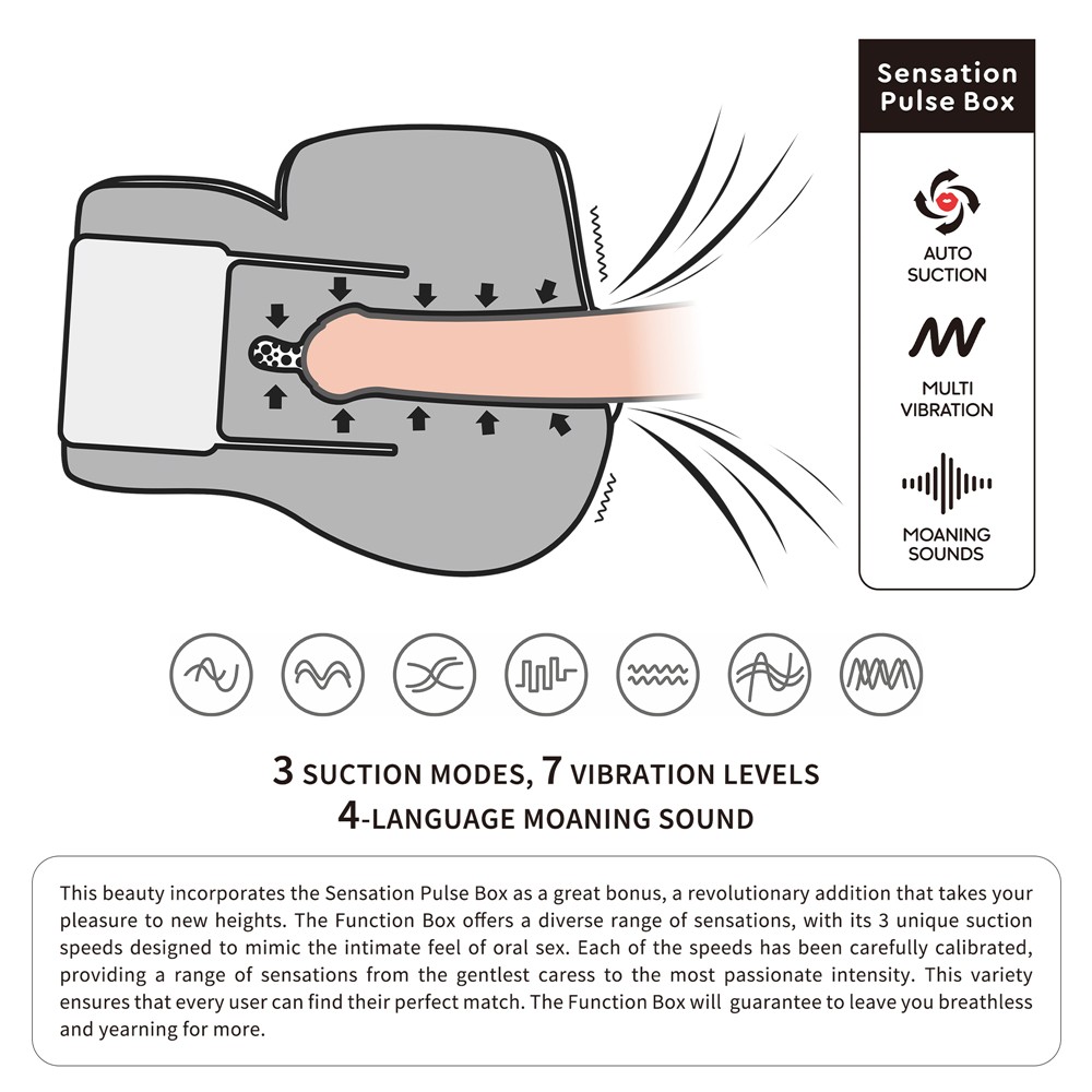 Masturbatore maschile ano vagina morbida vibrante con vibrazione e mutandine BITCH Streetgirl's Sensation Pulse (Brown) I Ecco il nostro strumento di piacere dal design squisito, il Masturbatore Streetgirl con la rivoluzionaria Sensation Pulse Box. Questa bellezza è progettata per elevare le tue esperienze intime a nuove vette, offrendo un'irresistibile combinazione di piacere e grande funzionalità. Caratterizzato da una splendida vagina distesa con un design realistico, questo sofisticato dispositivo di piacere è accompagnato dall'allettante e sexy Boudoir Thong, progettato per stimolare i tuoi sensi dal momento in cui ti concedi. Misurando 7,7" x 7,8" x 5,5" (19,7x20x14 cm) e pesando 5,56 libbre (2,52 kg), il suo corpo elegante è costruito per resistere ad anni di intenso piacere. Questa bellezza incorpora la Sensation Pulse Box come un grande bonus, un'aggiunta rivoluzionaria che porta il tuo piacere a nuove vette. La Function Box offre una vasta gamma di sensazioni, con le sue 3 velocità di aspirazione uniche progettate per imitare la sensazione intima del sesso orale. Ognuna delle velocità è stata attentamente calibrata, fornendo una gamma di sensazioni dalla carezza più delicata all'intensità più passionale. Questa varietà assicura che ogni utente possa trovare la sua corrispondenza perfetta. La Function Box ti garantirà di lasciarti senza fiato e desideroso di altro. Con l'integrazione di suoni di gemiti realistici e 7 frequenze di vibrazione, questa Sensation Pulse Box va ancora oltre per garantire un'esperienza davvero strabiliante, evocando un piacere irresistibile con ogni esperienza delicata sulla pelle. Pulire questo lussuoso dispositivo di piacere è un gioco da ragazzi; assicurati di rimuovere la sensazione box prima della pulizia, quindi sciacquare semplicemente il canale con acqua corrente e asciugarlo. Per un divertimento ottimale, consigliamo di utilizzare abbondante lubrificante per garantire un ingresso senza sforzo a ogni utilizzo. Premere ripetutamente per passare da cinese, giapponese, inglese e coreano.