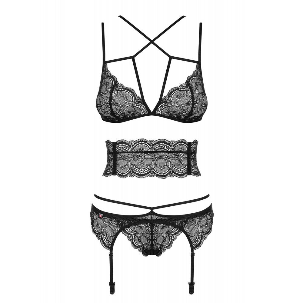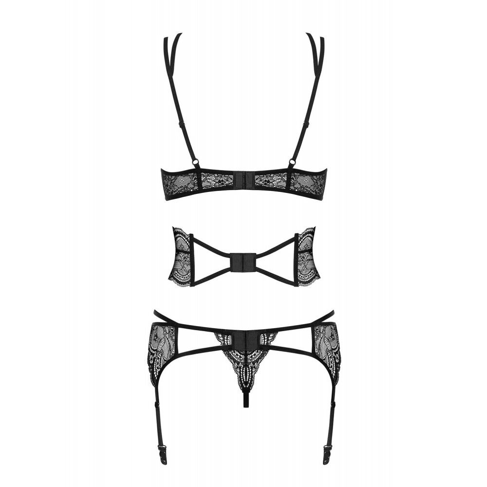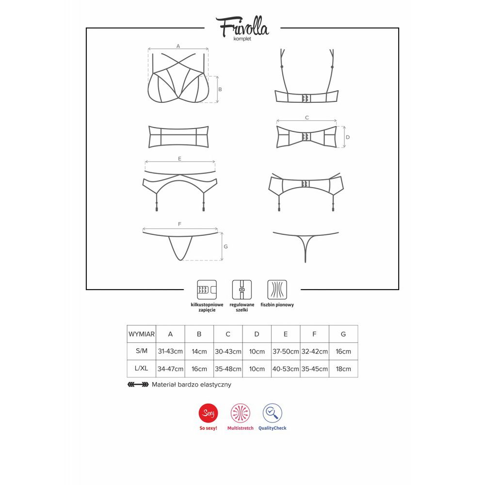 OBSESSIVE FRIVOLLA SET 4 PZ TG S-M DETTAGLI Incredibilmente stupendo e seducente. Allergherà il tuo corpo con pizzi perfettamente delicati e strisce giocose, dalla scollatura fino al fondoschiena. Incontra Frivolla! Quattro oggetti ammirevoli stanno arrivando da te con il loro fascino speciale. Il design assolutamente unico con cintura in pizzo civettuolo ti permetterà di essere una tentatrice sexy. Così? Prendilo, indossalo e divertiti! Ecco cosa puoi ottenere: • fantastico, set da 4 pezzi • reggiseno in pizzo delicato – look da seno sottile • reggiseno con chiusura regolabile e spalline regolabili – facile da indossare • accattivante combinazione di strisce elastiche sulla scollatura • cintura in pizzo con stecche verticali e chiusura regolabile – vita sexy! • reggicalze facilmente regolabile con striscia civettuola intorno alla zona dei fianchi • perizoma in pizzo incluso • materiali morbidi ed elastici (90% poliammide, 10% elastan)