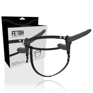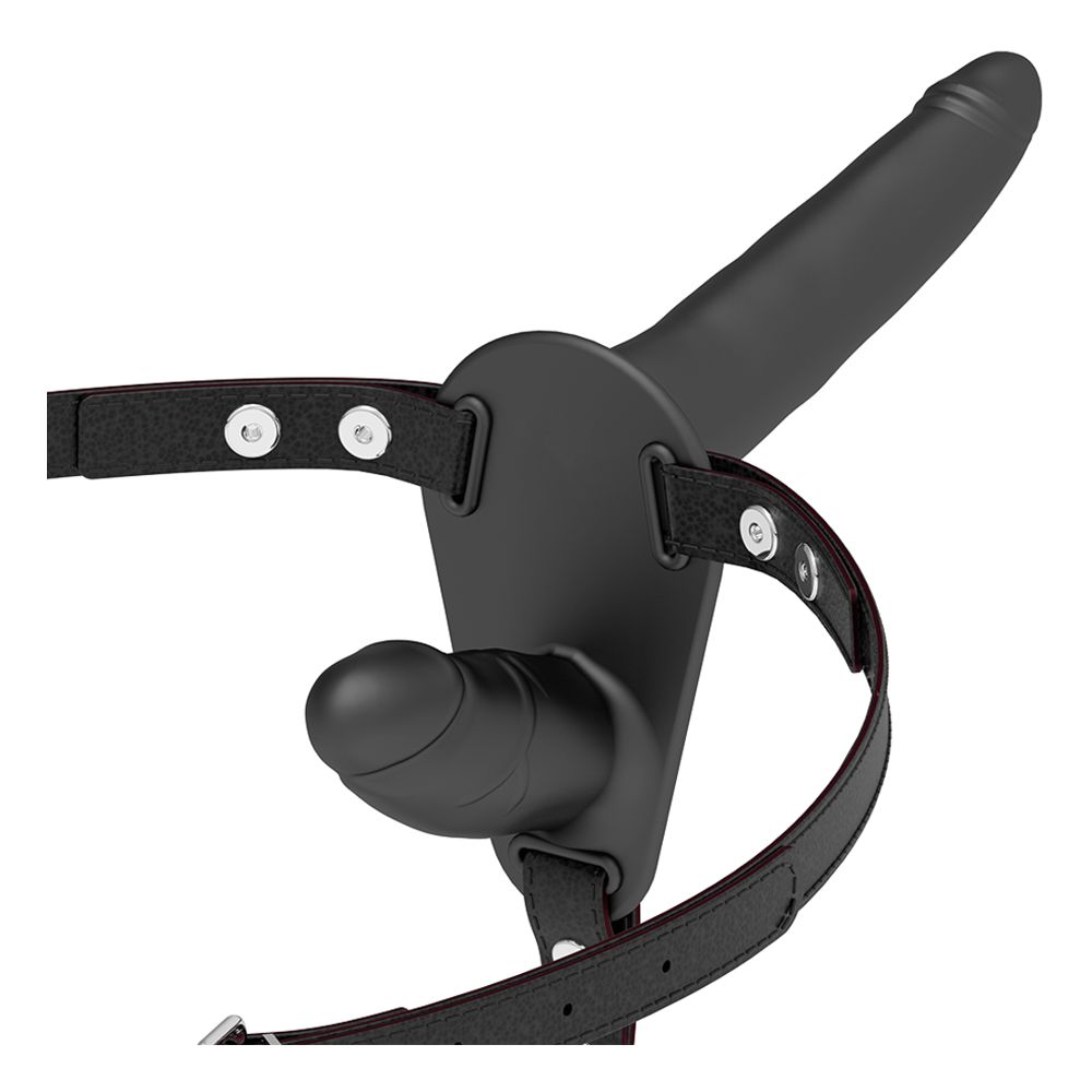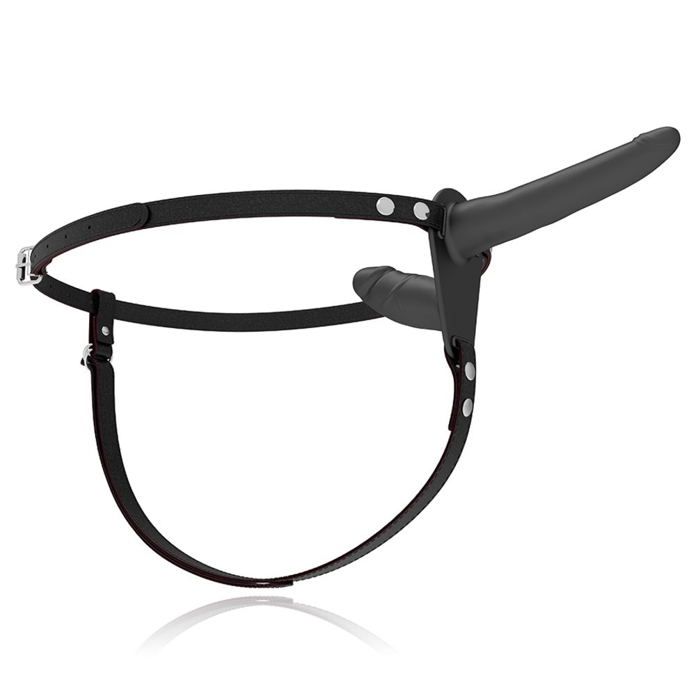 Strap on da donna con doppio dildo interno esterno in silicone nero e cinturino regolabile. FETISH SUBMISSIVE HARNESS - DOPPIA PENETRAZIONE NERA Imbracatura a doppia penetrazione regolabile per qualsiasi misura di fianchi, anche i più grandi. Il dildo è fatto di silicone di prima qualità. Il silicone ipoallergenico certificato di grado medico si distingue per la sua sensazione setosa e l'eccellente capacità di scorrimento. Per poter godere a lungo del tuo nuovo amico, ti consigliamo di utilizzare un lubrificante a base d'acqua nei tuoi giochi più bagnati. Questo protegge il materiale e la superficie rimane setosa. Puoi lavare il tuo giocattolo molto facilmente con acqua e un sapone delicato. Per un'igiene più accurata, usa anche uno speciale detergente disinfettante per giocattoli sessuali come Waterfeel o Nina kikí toy cleaner. Il resto dei materiali che compongono l'imbracatura sono realizzati in Abs con dettagli in metallo. Entrambi i dildo hanno una lunghezza di 15 cm il più grande e di 8 cm il più piccolo. Taglia unica. Progettato specificamente per le donne che desiderano penetrare sia uomini che donne indifferentemente.